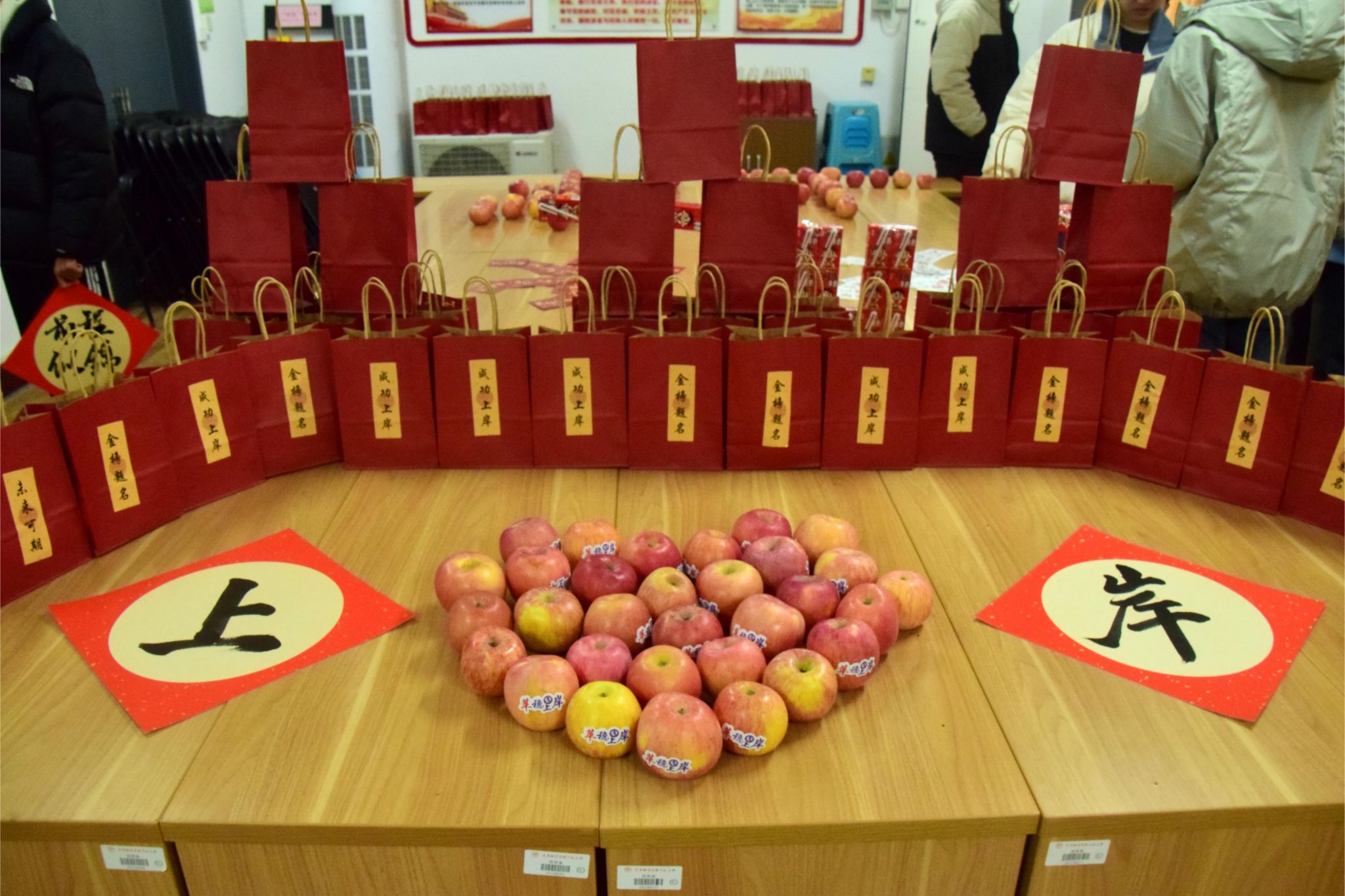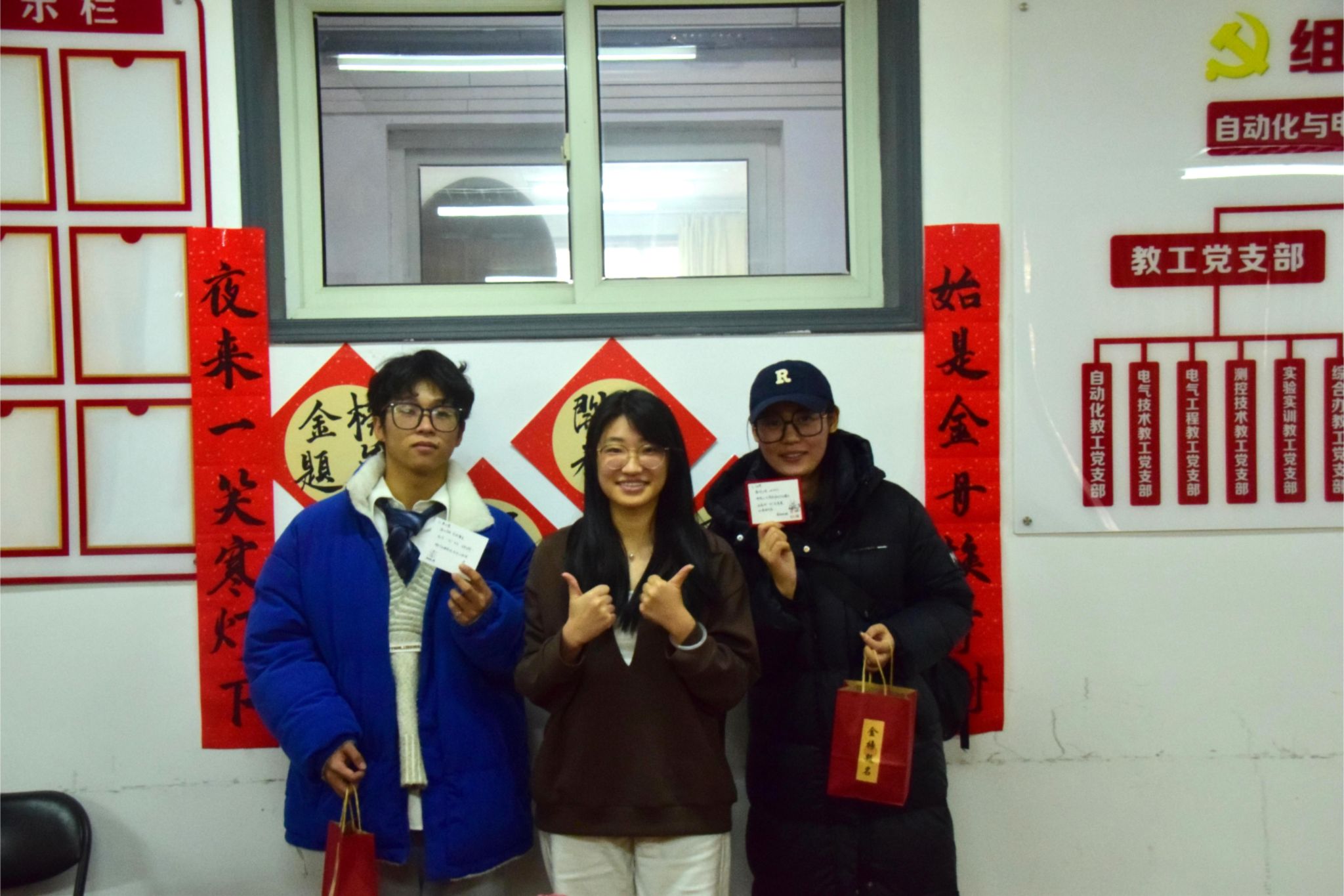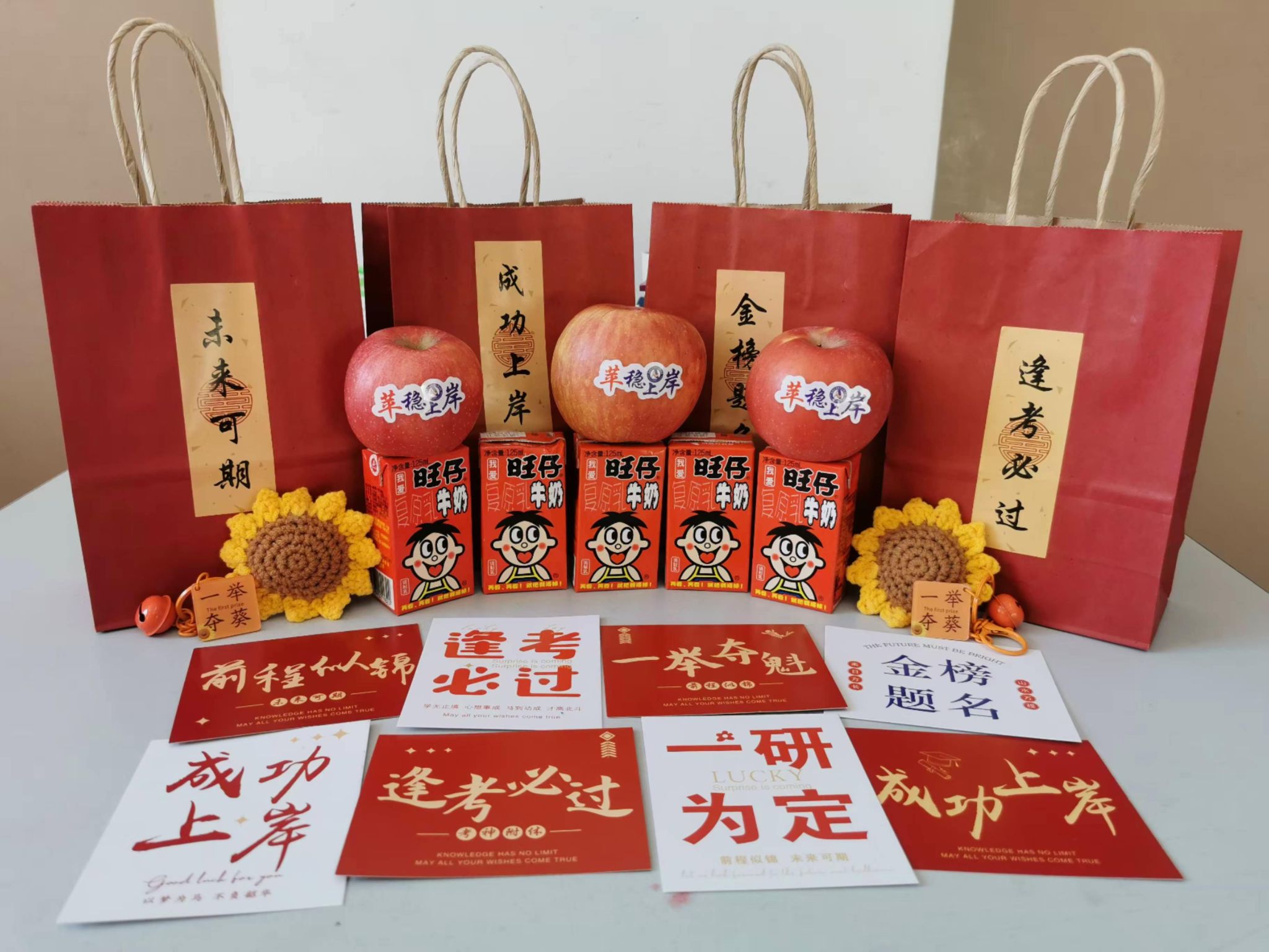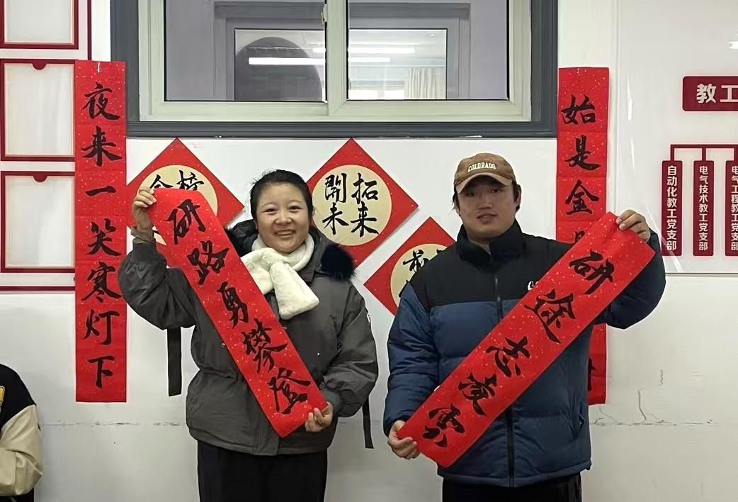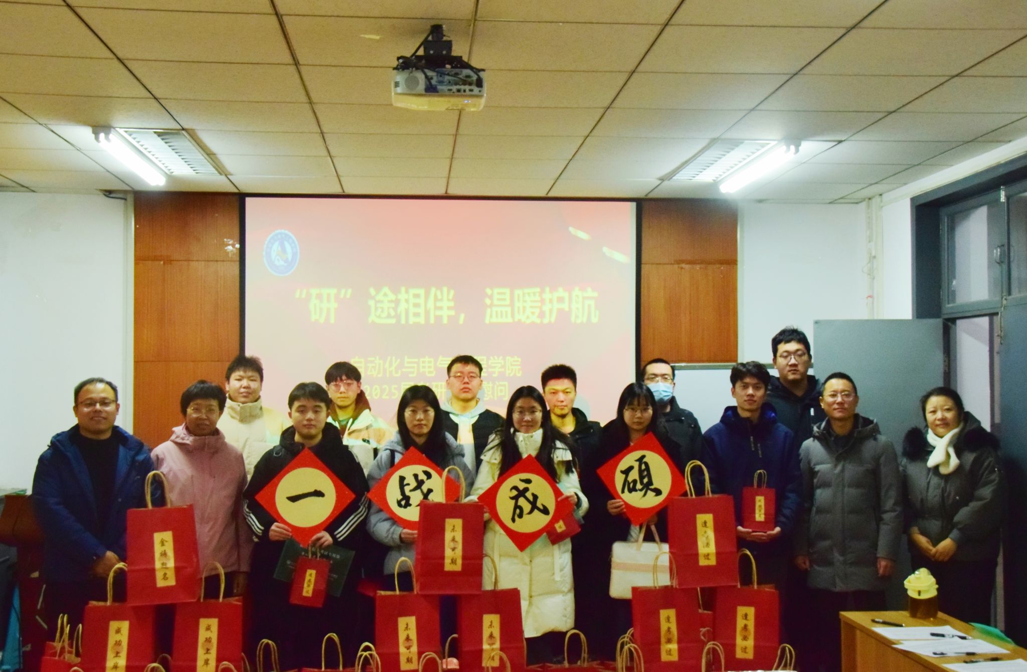 活动过程中,领导老师们为考研学子送上精心准备的考研慰问大礼包,每一份礼品都饱含深意,寓意考研学子逐梦之路“旺”上加旺、一举夺“葵”、“苹”稳上岸,凝聚着学院对考研学子深切的关爱与诚挚的祝福,承载着对学子们顺利“上岸”的美好期冀。由电气2413班韩开创创作的书法作品被布置成为“研”途暖“新”拍照打卡点,考研学子们兴高采烈地手持书法作品,与老师和同学们合影留念。