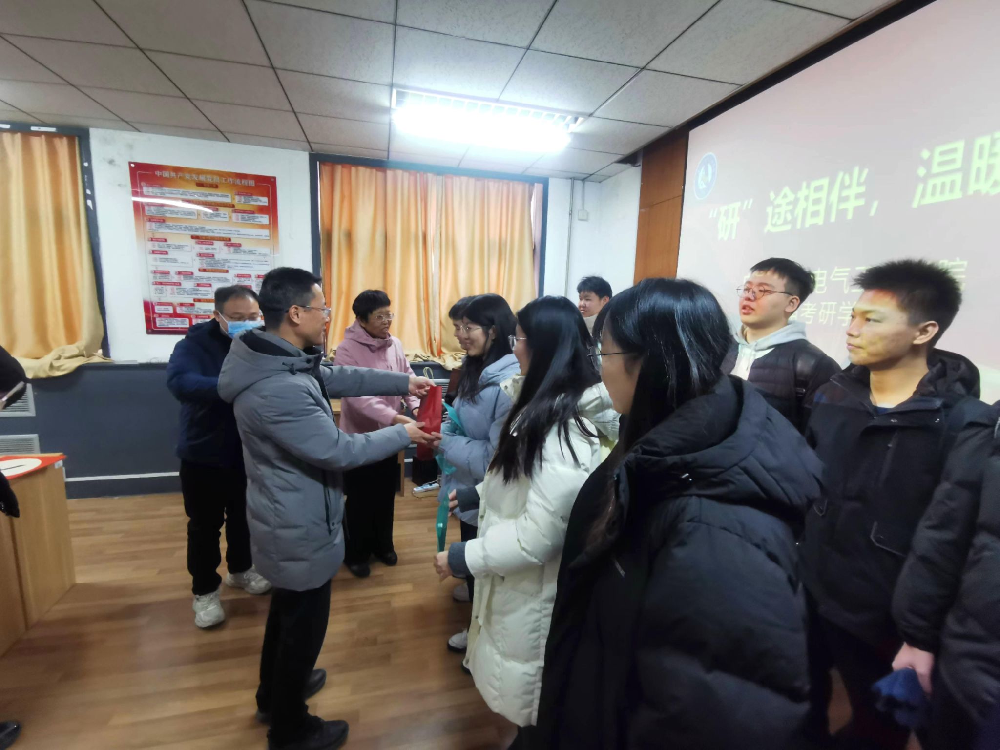 精心组织开展“‘研’途相伴·温暖护航”2025届考研学生慰问活动。学院党委书记吴平、院长王冬霞亲临现场,毕业班辅导员及学院就业指导服务委员会成员积极筹备并参与本次活动。