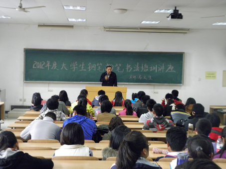 承办的2012年度大学生钢笔粉笔书法培训讲座在C楼206教室成功举办。天津市书法家协会会员、魔镜号