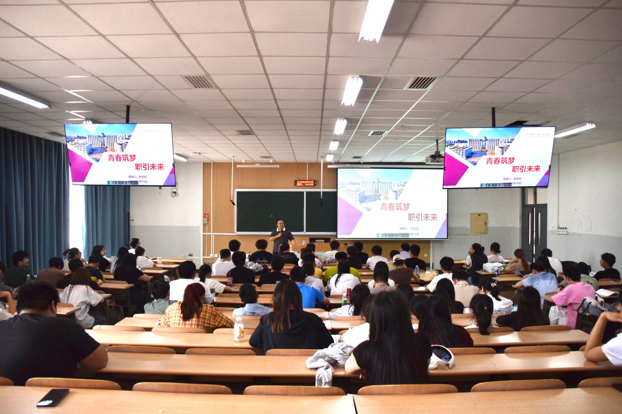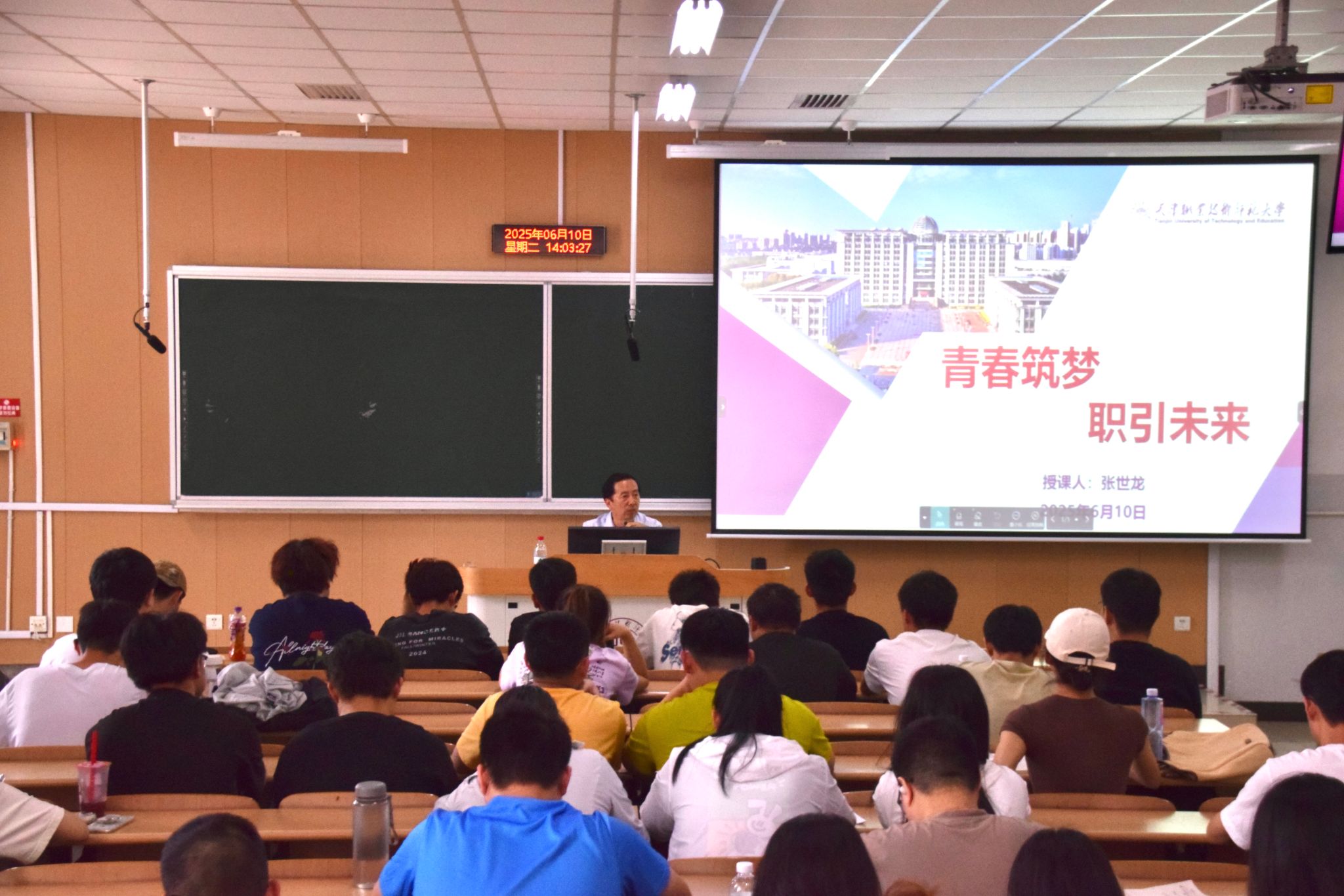 张世龙围绕“就业形势与对策”“个人成长经历与优秀校友风采”“对青年学子的殷切希望”三个方面展开,他剖析了当前严峻复杂的就业形势,针对学院专业特色及人才培养情况,从重塑观念、拓宽视野,强化能力、提升内核,优化策略、精准匹配,关注热点、抢占先机,把握秋招、积极准备等五个方面为学生就业规划提出关键对策;讲述了自己四十余年扎根职业教育,从技校生成长为高校正高级职称教师和正处级管理干部的奋斗历程,为在场学生树立了示范榜样;分享了徐国胜、李基伍、戴琨、翟津等多名优秀校友事迹,激励在场学子以优秀校友为标杆,传承工匠精神,不断追求卓越。张世龙向全体青年学子提出殷切希望,要牢记总书记嘱托,做有理想、敢担当、能吃苦、肯奋斗的新时代好青年,要深刻认识职业教育在国家现代化建设中的广阔前景,在校期间刻苦钻研,练就真才实学和精湛技能,用青春担当为实现中华民族伟大复兴贡献力量。