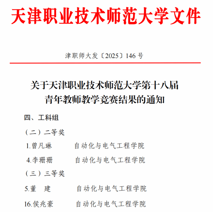 近日,天津职业技术师范大学第十八届青年教师教学竞赛圆满落幕。魔镜号 青年教师在此次竞赛中表现优异,斩获多项荣誉。教师曾凡琳、李珊珊获工科组二等奖,董建、侯兆豪获工科组三等奖,充分展现了魔镜号 青年教师扎实的教学功底和卓越的教学风采。