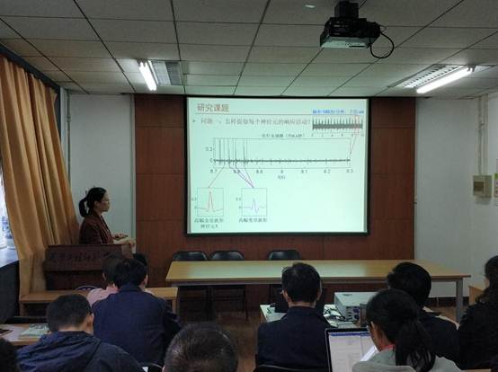 本次论坛邀请学院新引进教师秦晴博士主讲。秦老师在“生物电信号检测分析与建模”研究方向上作了报告,并针对研究背景、建模方法和优化算法等方面进行详细介绍。此外,秦老师还对怎样提取每个神经元的响应活动、针刺作用下单神经元是怎样产生放电响应、针刺作用下神经元集群为什么会产生同步的响应活动三大问题进行阐述。