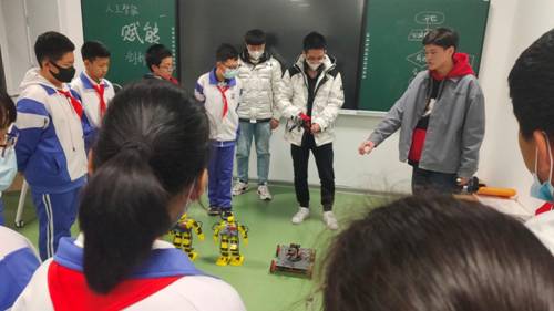 11月24日下午,学院的4名同学在科技辅导员王永亮老师的带领下,携带4台移动机器人为第二新华中学的学生上了一堂生动的机器人课程,为同学们讲解了移动机器人的种类、结构等,该校20余名师生参与,精彩的授课内容受到师生的一致好评。