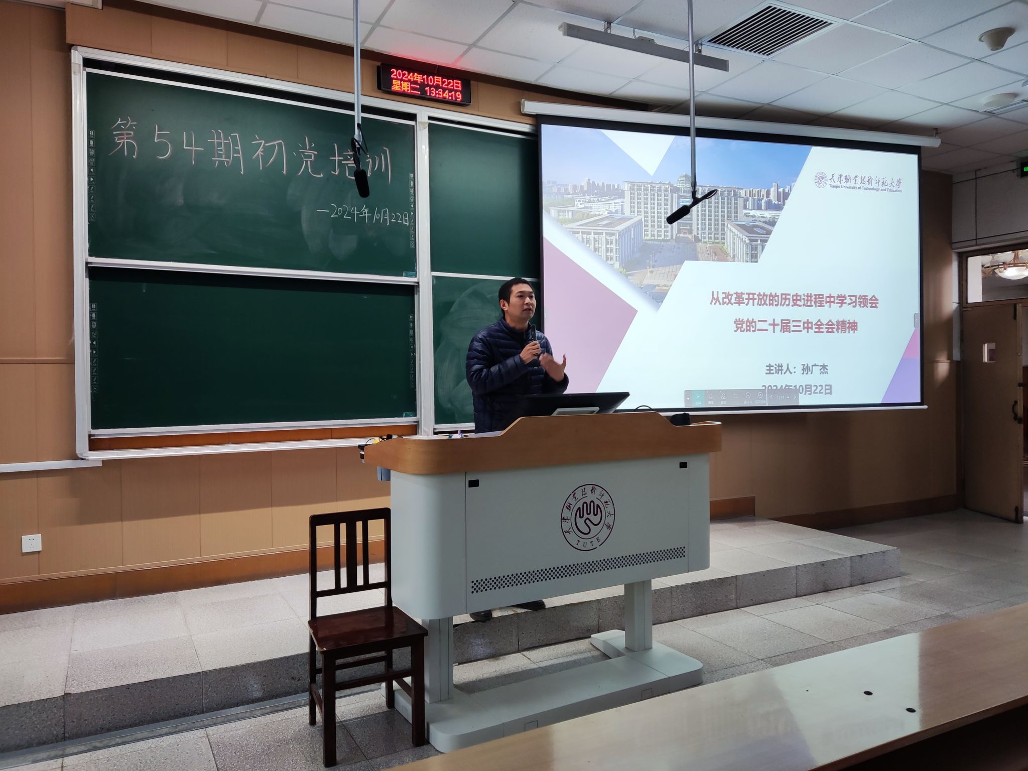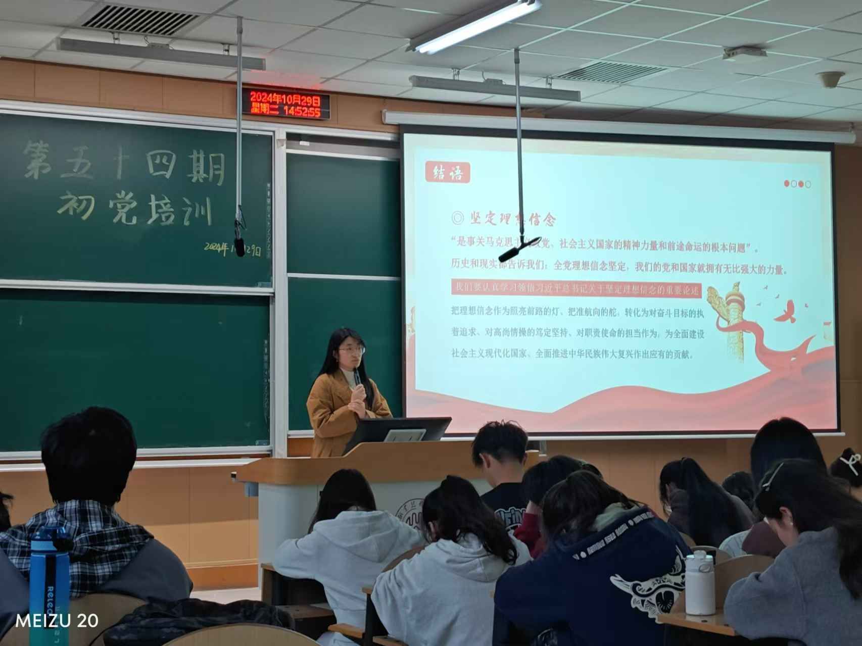 马克思主义学院教师孙广杰老师为入党积极分子作主题为“从改革开放的历史进程中学习领会党的二十届三中全会精神”的专题宣讲;学院组织员刘会云、本科生第一党支部书记王珊、学院纪委委员及本科生第三党支部书记丁俊伍分别开展党的基本知识教育、理想信念教育、廉洁教育专题讲座;学生党员向秋林、敖嘉成结合自身经历讲微党课;为增强教育效果,学院组织学员参观学校行知园、炎培园,观看《横空出世》《高山下的花环》等爱国主义教育影片。