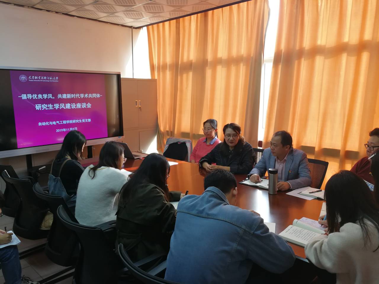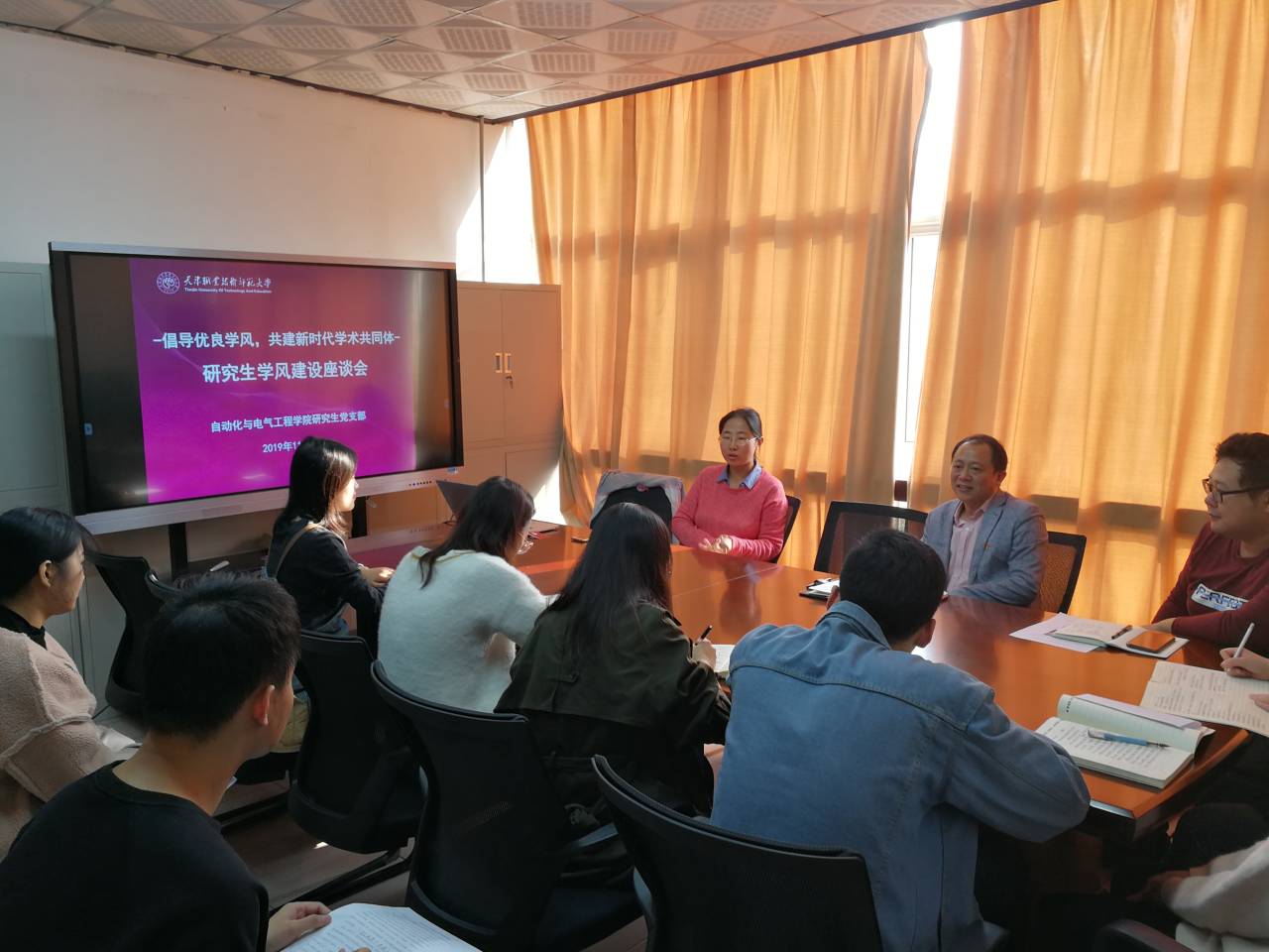 研究生党支部在自动化东楼301召开“倡导优良学风,共建新时代学术共同体”研究生学风建设座谈会。会议由党支部书记李敏主持,学院副院长赵丽、导师韩春晓、研究生秘书张宏鑫及研究生代表参加此次座谈。