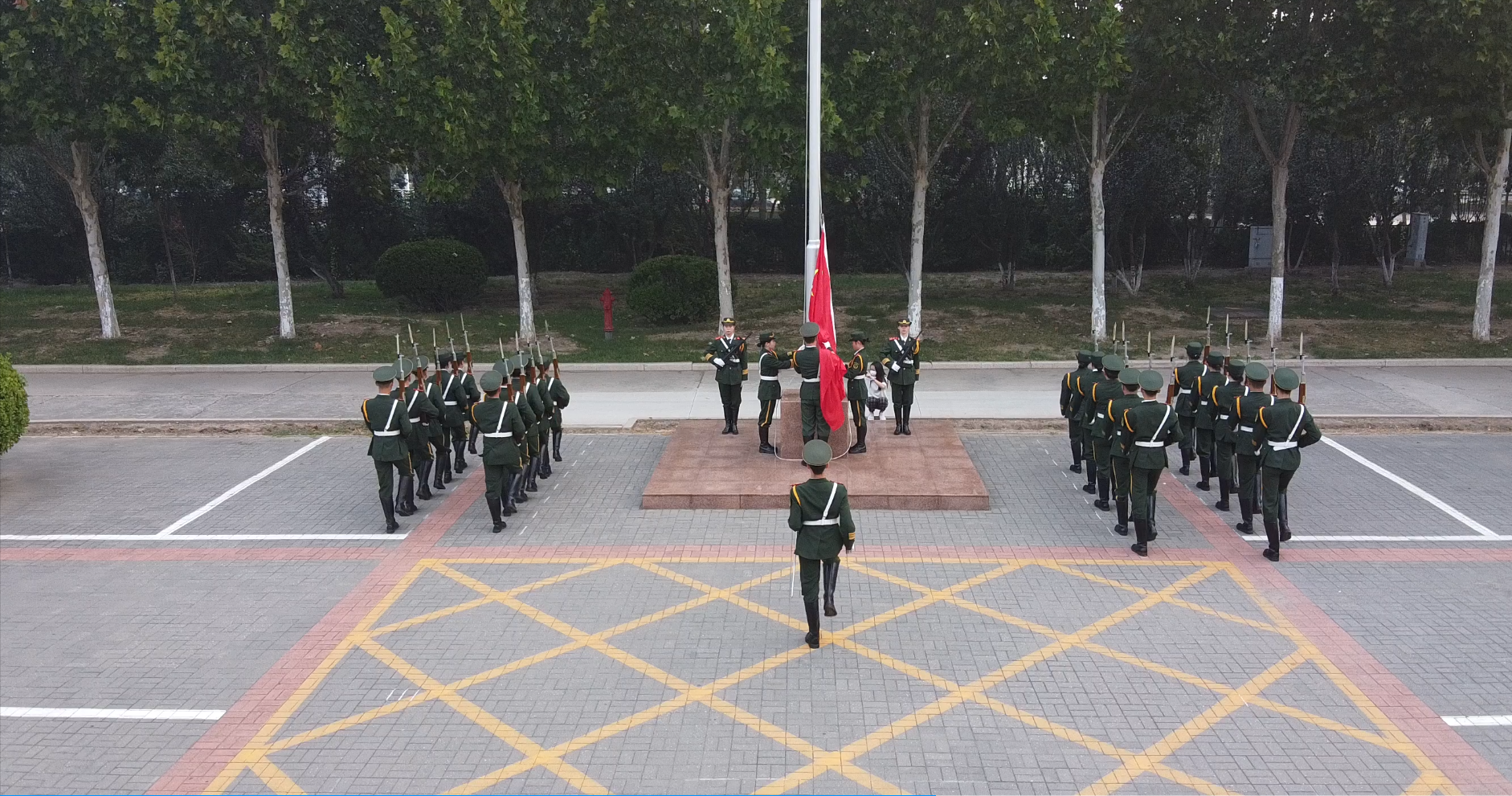秋风徐徐,伴随着渐渐苏醒的晨曦,在全体师生的注视下,国旗护卫队队员们踏着整齐的步伐,一路将国旗护送到升旗台,旗手将鲜艳的国旗上扬抛出,五星红旗徐徐升起,迎风飘扬。