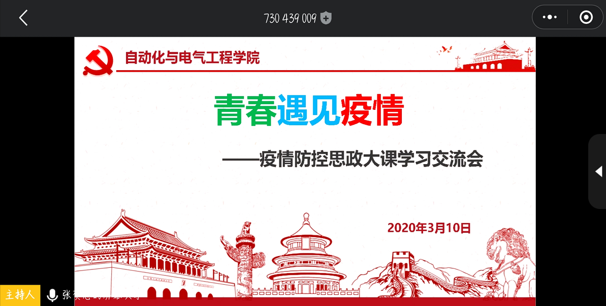 在抗击疫情的非常时期,为将高校思想政治理论课教学优势转化为支持防疫斗争的强大力量,由教育部社会科学司与人民网联合组织“全国大学生同上一堂疫情防控思政大课”如期直播。自动化学院第一时间响应学校号召,积极组织、提前预告,确保全覆盖,让全院学生同全国其他大学生们一起如期同上这堂特殊的思政课。