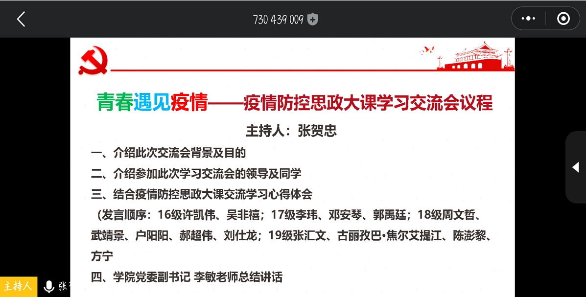为此,学院于3月10日组织召开“青春遇见疫情”疫情防控思政大课在线学习交流会。学院党委副书记李敏、部分辅导员和14名来自全国各地的学生代表参加了交流。