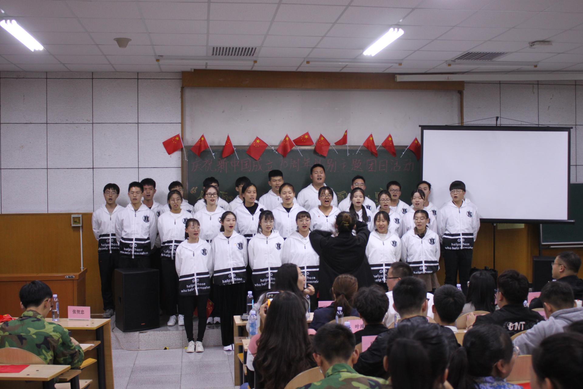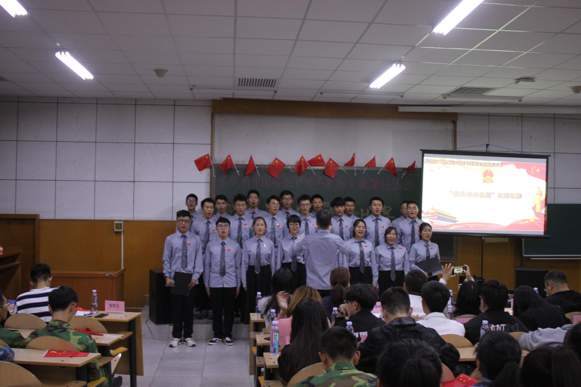 在阶教101组织团员青年参加庆祝新中国成立70周年特别主题团日活动——“我和我的祖国”红歌比赛。本次比赛共有19支队伍参赛,学院团委书记仲伟邦﹑学院学生工作办公室主任郭丽芳﹑各年级辅导员、校学生会文体部部长、学院学生会、学管会、团建中心、艺术团派代表到场观看比赛。