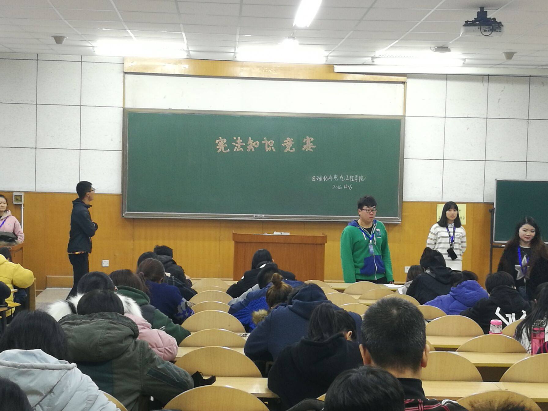 组织开展学生“学宪法讲宪法”系列活动过程中,首先组织全体学生登录教育部全国青少年普法网,观看宪法学习视频。其次,为使宪法学习活动覆盖全体学生,学院组织各班以宪法学习为主题开展主题班会,引导各班集中开展读宪法原文活动,促使学生学懂弄通。最后在组织集中学习、自学宪法基础上,各班推荐四名学生参加学院宪法知识竞赛。宪法知识竞赛以赛促学,促使全体学生进一步学习、熟悉宪法知识,努力成为宪法的遵守者、捍卫者。