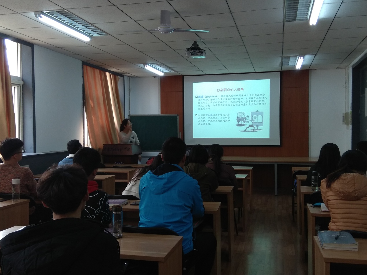 宣讲伊始,韩春晓老师介绍了科学道德规范的性质和特点,列举分析了近年来国内外学术不端行为的众多实例,以此告知学生对学术的敬畏之心是做学术研究的关键,勉励学生遵守学术规范。随后她强调发表学术论文的“五不准”原则,进一步阐述了研究生应遵守的十大学术规范,同时结合自身经验,分享了文献阅读及科研工作的感悟和方法。韩春晓老师坚定且生动的讲解,引起了与会学生的共鸣,获得了大家的热烈掌声。