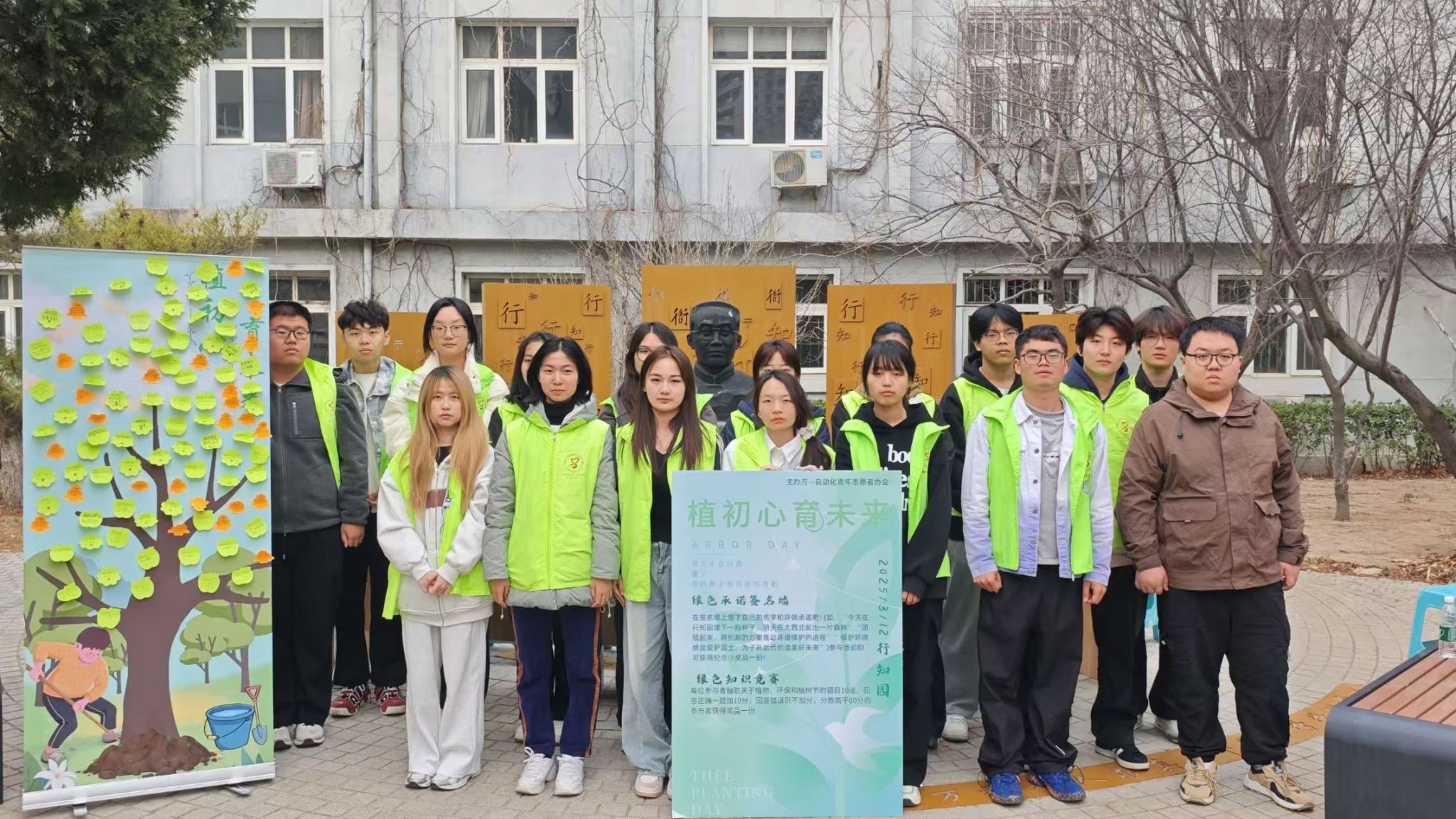 青年志愿者协会于行知园开展“植初心,育未来”植树节主题活动。本次活动通过知识竞赛、环保承诺、互动实践等形式,吸引百余名同学参与,在校园内掀起了一股“绿色行动”热潮。