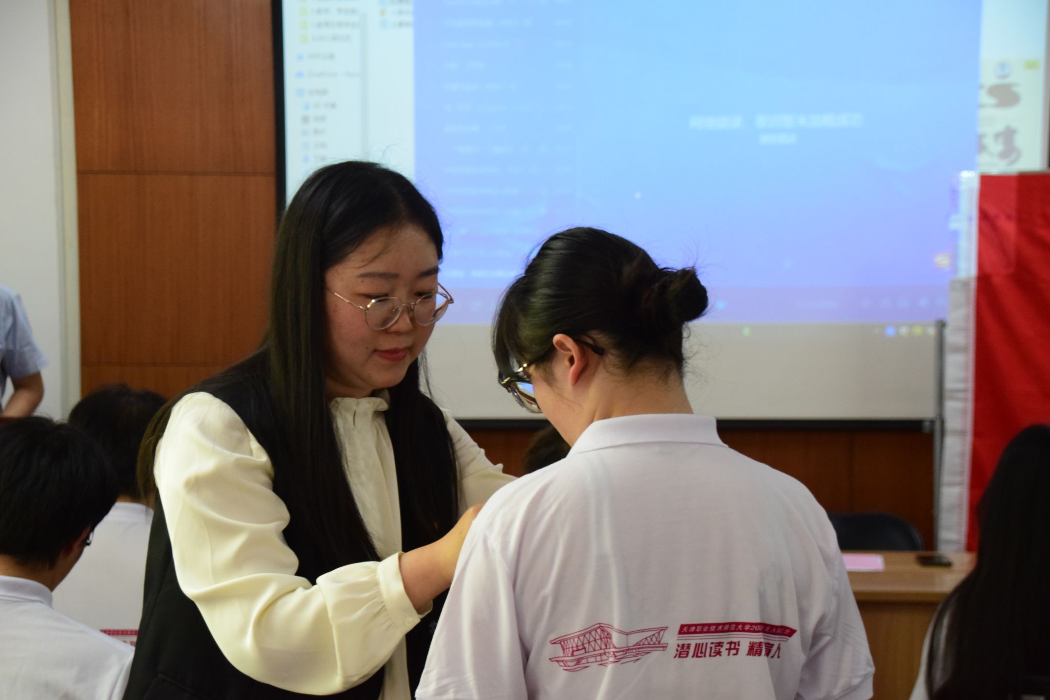 会议伊始,王超宣读本次新发展团员名单,并由程君和王超逐一为新团员佩戴团徽。随后,全体新团员高举右拳在团旗下庄严宣誓,电自2402范洋瑞作为新团员代表分享自己对共青团组织的向往并表示将努力学习专业知识,积极参与社会实践,用实际行动践行团员的使命和担当。
