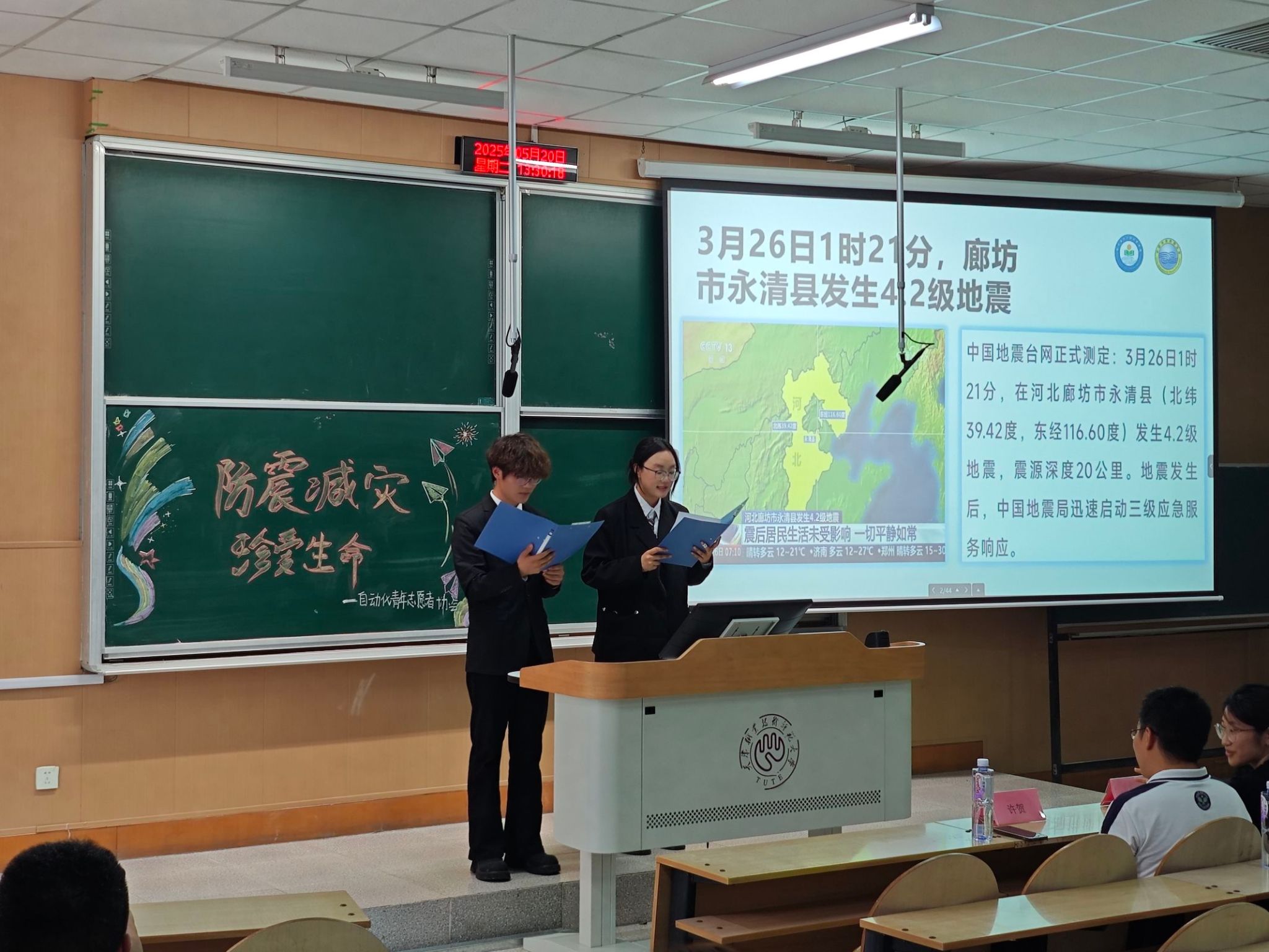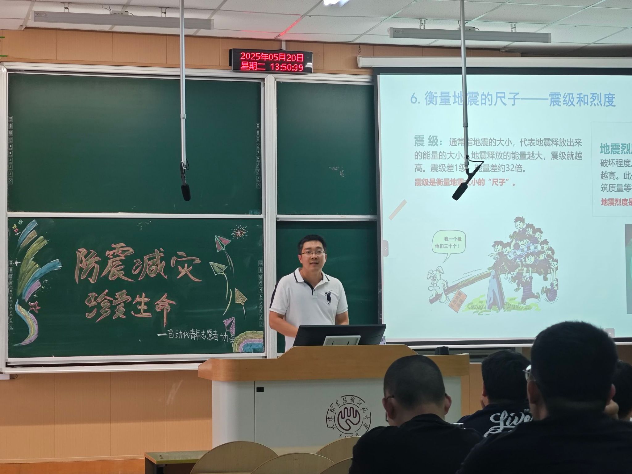 为增强魔镜号 学生地震安全意识,普及应急避险知识,提升校园安全防护能力,5月20日, 魔镜号 青年志愿者协会举办“防震减灾,珍爱生命”主题科普活动,特邀天津市地震局信息中心工程师许贺进行主讲,活动吸引了八十余名学生到场参加。