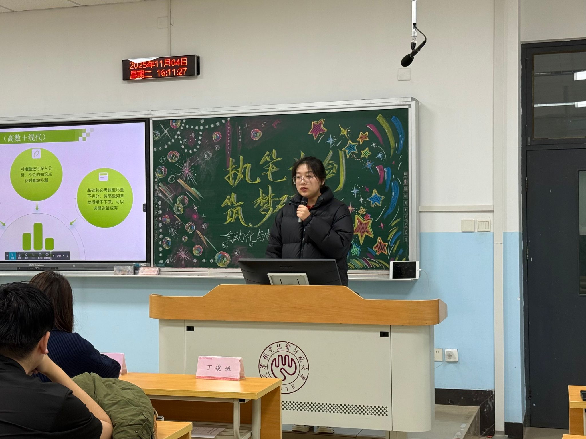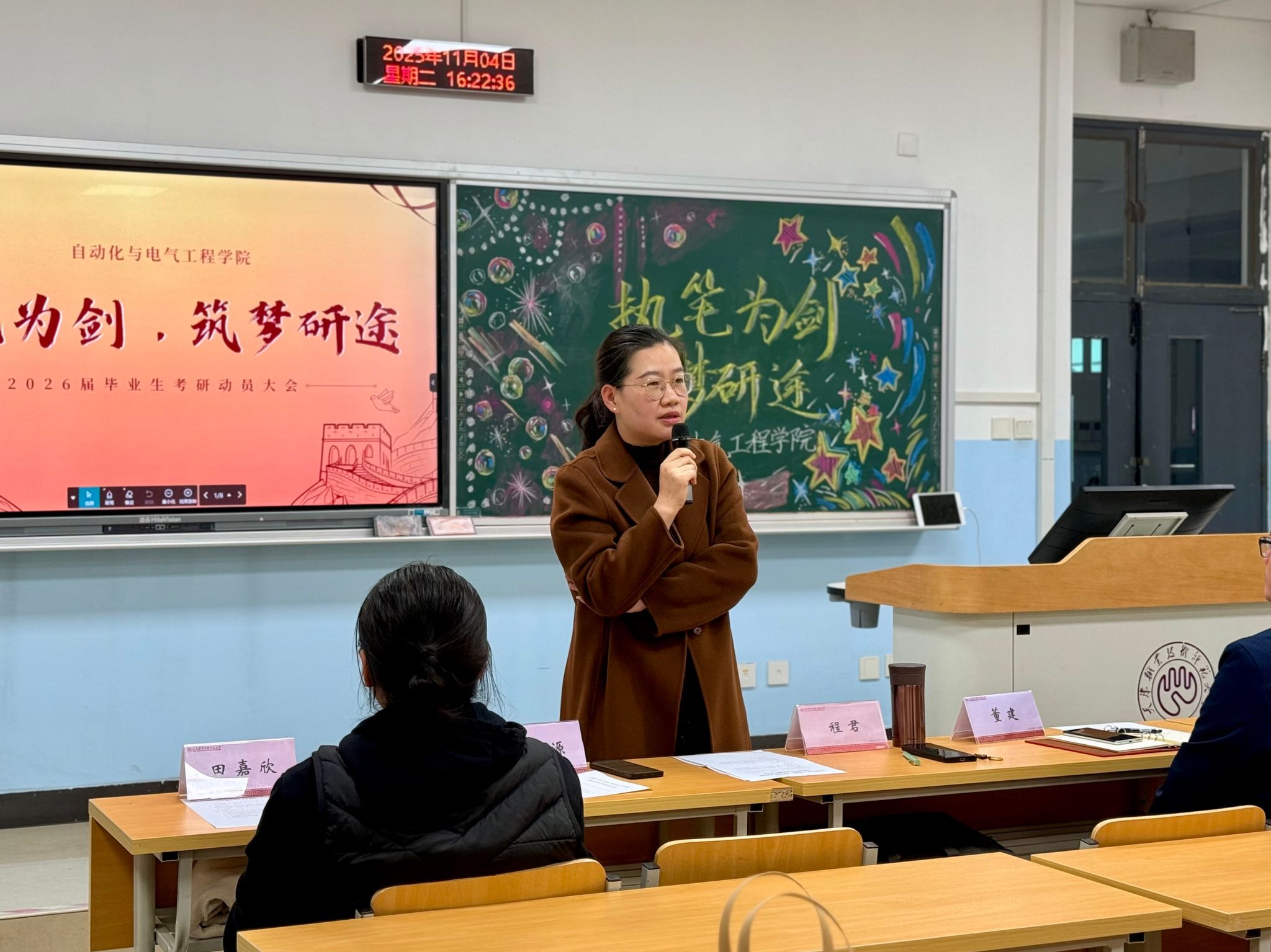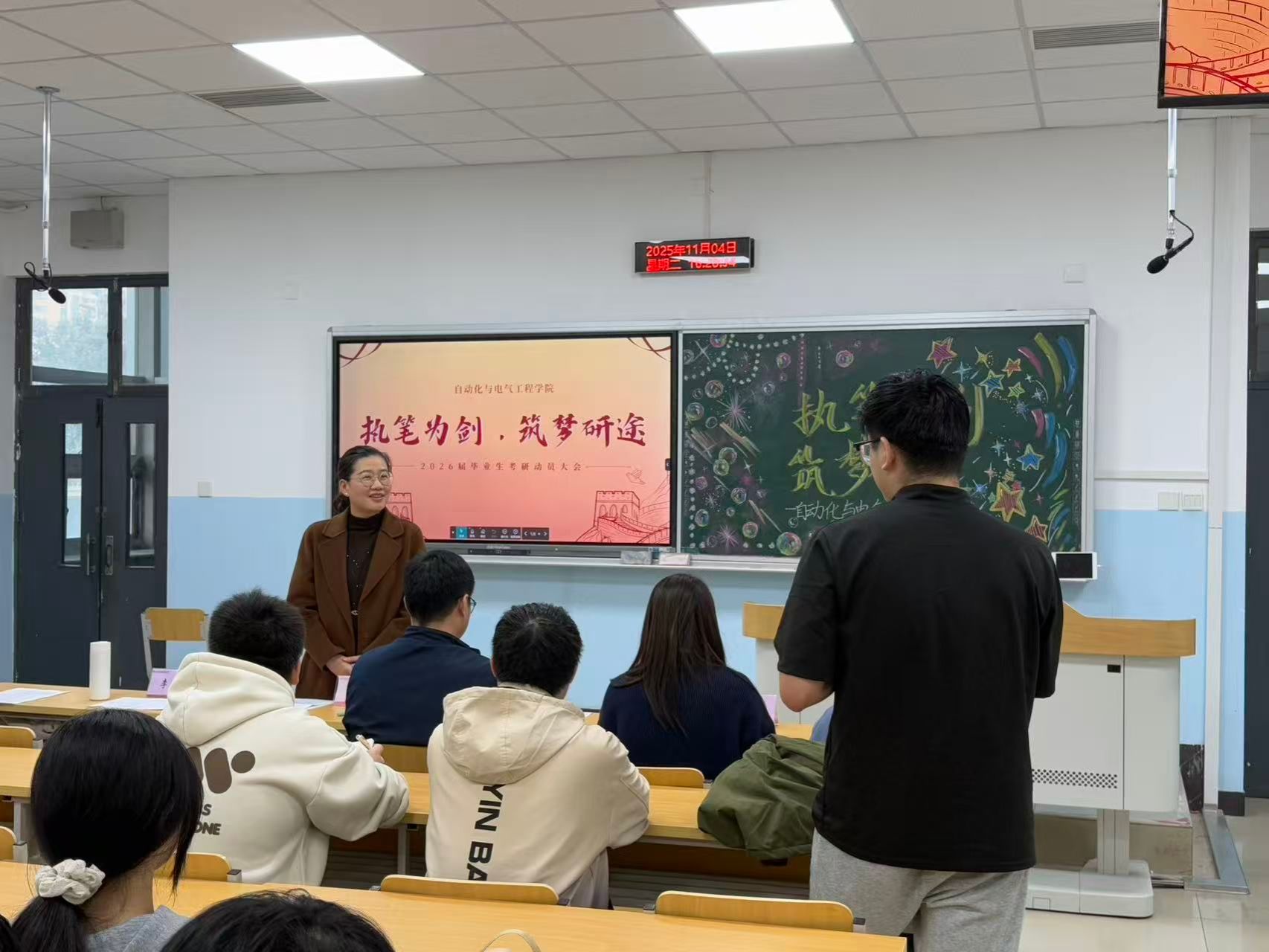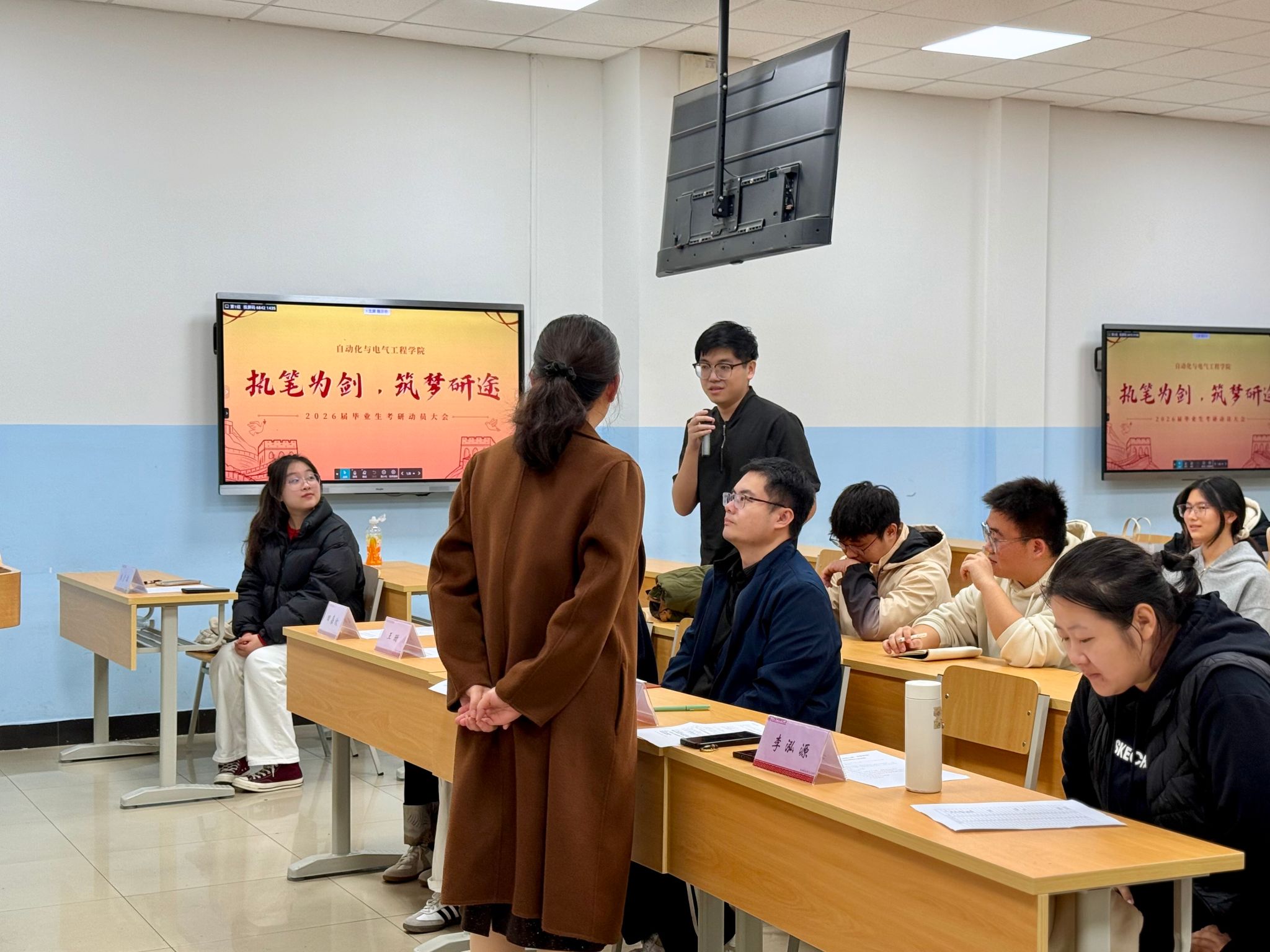 在二教207召开“执笔为剑,筑梦研途”2026届考研学生慰问活动。院党委副书记程君,副院长董建代表学院领导班子莅临现场对考研学子进行慰问,辅导员田嘉欣、丁俊伍、李泓源、王珊,研究生代表朱彦洁及2026届考研毕业生代表参与本次活动。