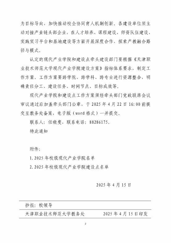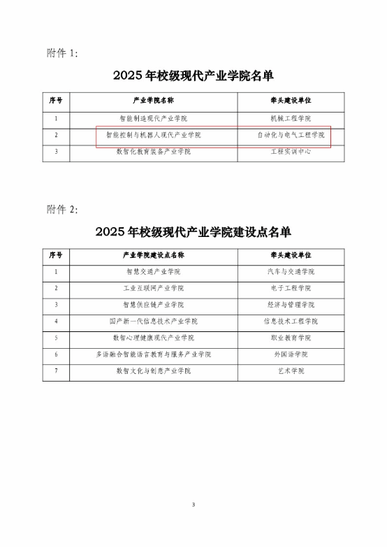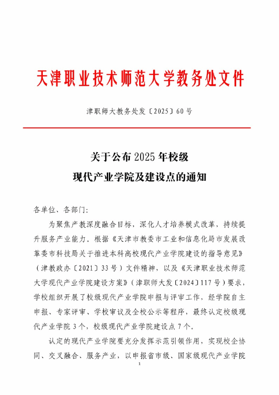 积极响应学校战略布局,根据《天津职业技术师范大学现代产业学院建设方案》(津职师大发〔2024〕117号)和《关于开展天津职业技术师范大学2025年校级现代产业学院申报工作的通知》(津职师大教务处发〔2025〕7号)等文件精神,经学院申报、专家评审、学校审议等程序,被学校认定为校级现代产业学院——智能控制与机器人现代产业学院。
